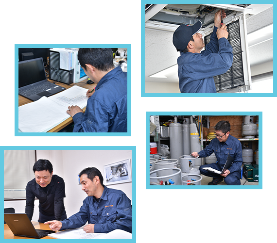 空調設備工事をはじめとし、換気設備、電気設備、内装、搬出入など、まとめて一式工事を請け負っております。